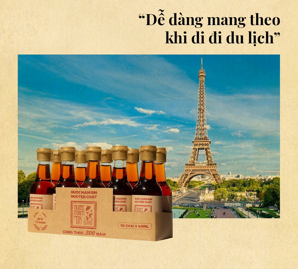 - Thiết kế chai mini 60ml nhỏ gọn, thuận tiện cho việc mang đi hoặc di chuyển khi đi du lịch. Với thiết kế chai nước mắm Tĩn mini sẽ giúp cho khách hàng dễ dàng tiếp cận với nguồn nước mắm Rin có hương vị mặn mà truyền thống.