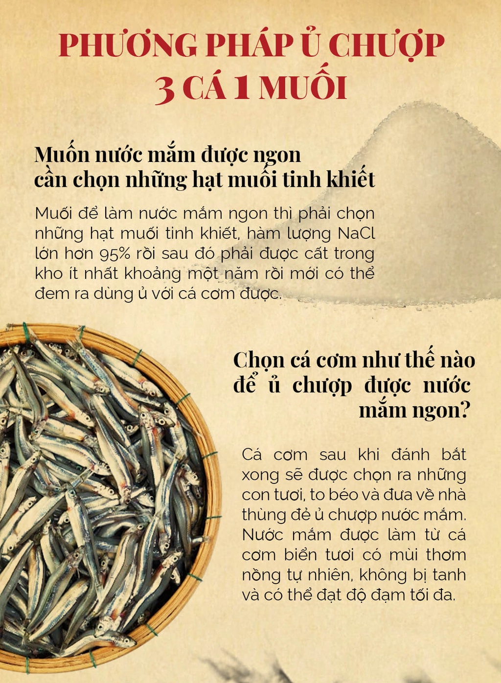Cá cơm tươi sẽ được chọn lọc thật, đem rửa sạch rồi trộn đều với muối biển theo tỉ lệ 3 cá : 1 muối. Nghĩa là cứ 3 tấn cá sẽ được trộn với 1 tấn muối biển sạch. Sau khi trộn cá và muối theo tỉ lệ trên sẽ cho tất cả vào thùng chượp bằng gỗ bời lời, được gia cố bởi những sợi dây thừng to làm bằng cây mây rừng.