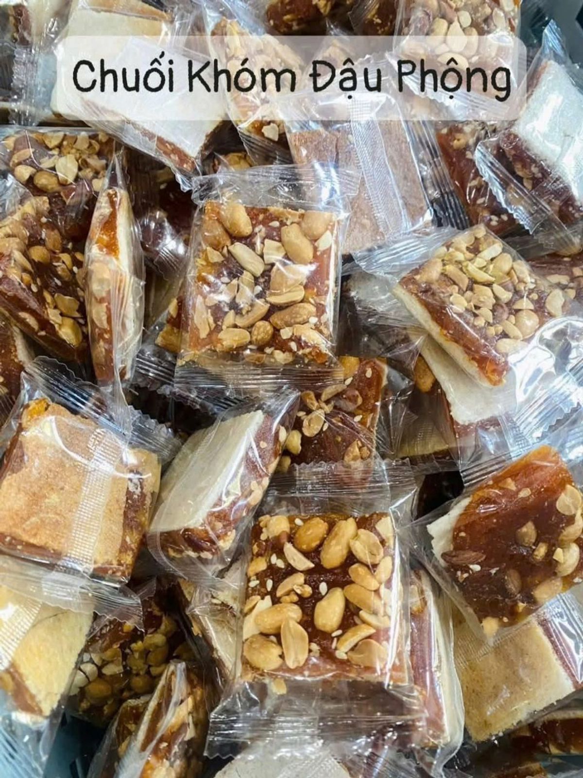 kẹo khóm chuối đậu phộng chua thanh ngọt nhẹ, nhiều đậu phộng, có 1 mặt cán bánh tráng giòn