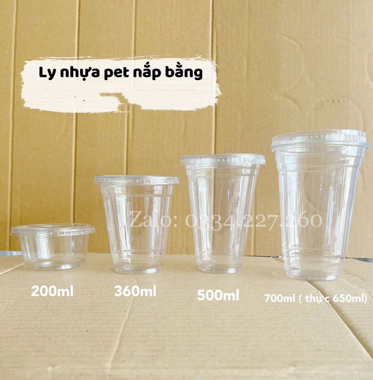 Ly nhựa PET nắp bằng là loại ly được sử dụng rộng rãi trong các quán ăn, quán cafe, quán trà sữa, nhà hàng, tiệc cưới và các sự kiện khác. Ly nhựa PET nắp bằng có nhiều kích thước khác nhau, bao gồm 360ml, 500ml và 700ml, đáp ứng nhu cầu của người sử dụng.