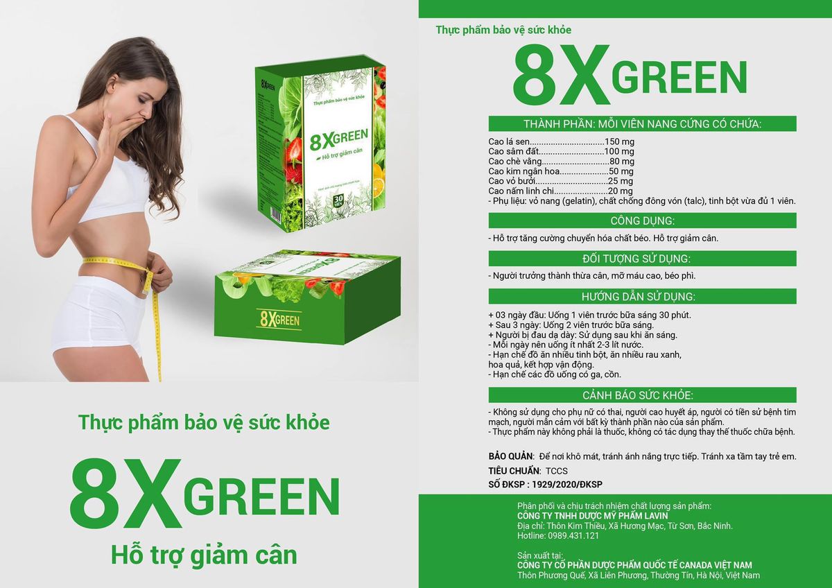 8X GREEN là loại thực phẩm bảo vệ sức khoẻ giúp hỗ trợ giảm cân cân vô cùng hiệu quả. Sử dụng các sản phẩm có tác dụng hỗ trợ giảm cân của Dược mỹ phẩm Lavin, khách hàng có thể hoàn toàn yên tâm bởi các sản phẩm đều có tác dụng giúp cơ thể săn chắc, không gây mệt mỏi, buồn ngủ như một số sản phẩm khác trên thị trường.