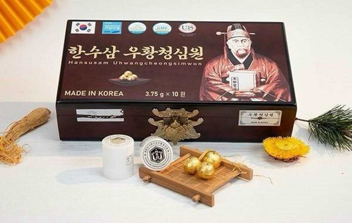 An Cung Ngưu Hoàng Hoàn Hansusam (3.75g x 10 viên) là sản phẩm hỗ trợ sức khỏe cao cấp từ Hàn Quốc, thường được đóng gói quy cách thùng 8 hộp gỗ.