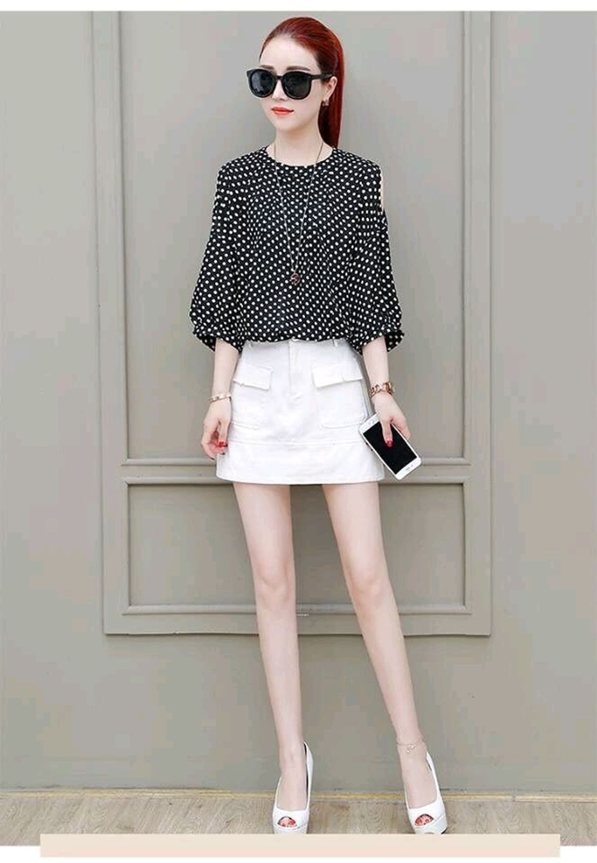 ÁO CHẤM BI HỞ VAI TAY BOMã: LL125DChất liệu: lụaMàu: đen, trắngKiểu dáng: áo form rộng, cổ nẹp tròn, xếp li trước ngực, cài nút sau cổ, hở vai, tay lửng nẹp laiSize: free 46~56kg, ngực 110, dài áo 59