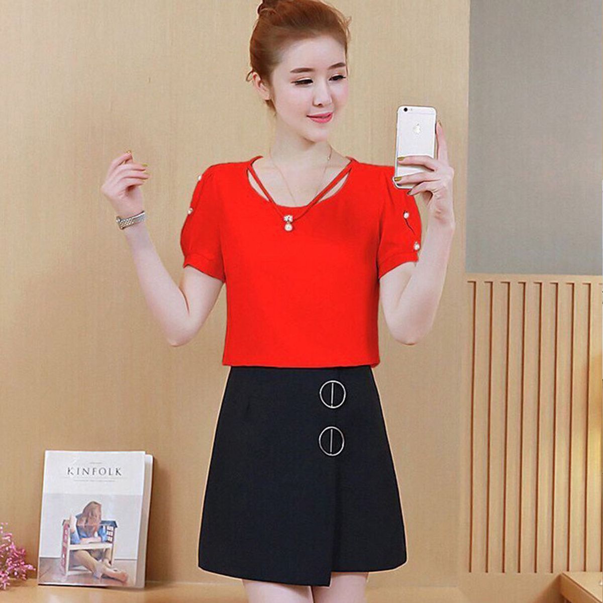 Kiểu dáng: áo suông, cổ tròn phối dây đính hạt, tay ngắn xẻ vai đính hạt, vạt ngang Chất liệu: đỏ tơ gân, trắng 2 loại vải tơ gân và xô gân, giãn nhẹ Màu sắc: đỏ, trắng