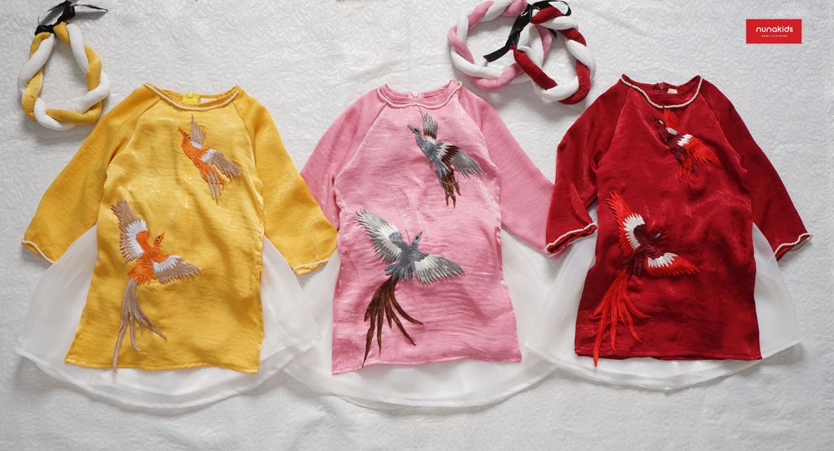 - Chất liệu: Chất liệu gấm lụa Tây thi , 1 sự lựa chọn hàng đầu cho áo dài. Mặt vải mịn, có độ ánh nhung, sờ mướt tay. Áo được đính kết đôi chim phượng tỉ mỉ, cầu kỳ. Phần tay và cổ áo được điểm xuyết bằng ngọc. Chân váy được thiết kế xòe bồng từng 2 lớp, 1 lớp boil Hàn - mềm mịn và 1 lớp voan ánh
