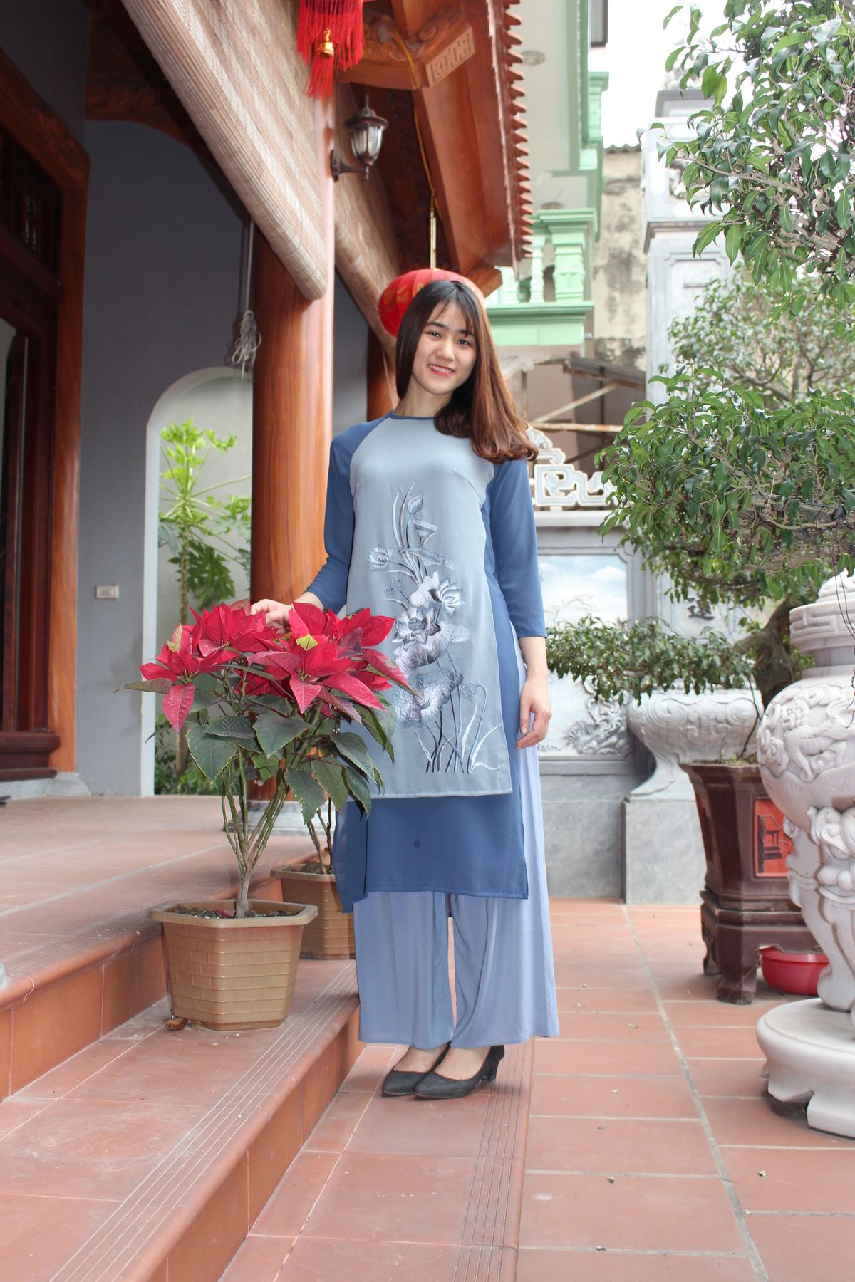 Áo dài 4 tà, dáng suông, thêu hoa sen -Chất liệu vải: áo von lụa chiffon, quần lụa habutai, mềm mại, bay tà. #Đủ size, S, M, L, XL. thiết kế dáng suông nên size XL khách nặng 78kg vẫn vừa