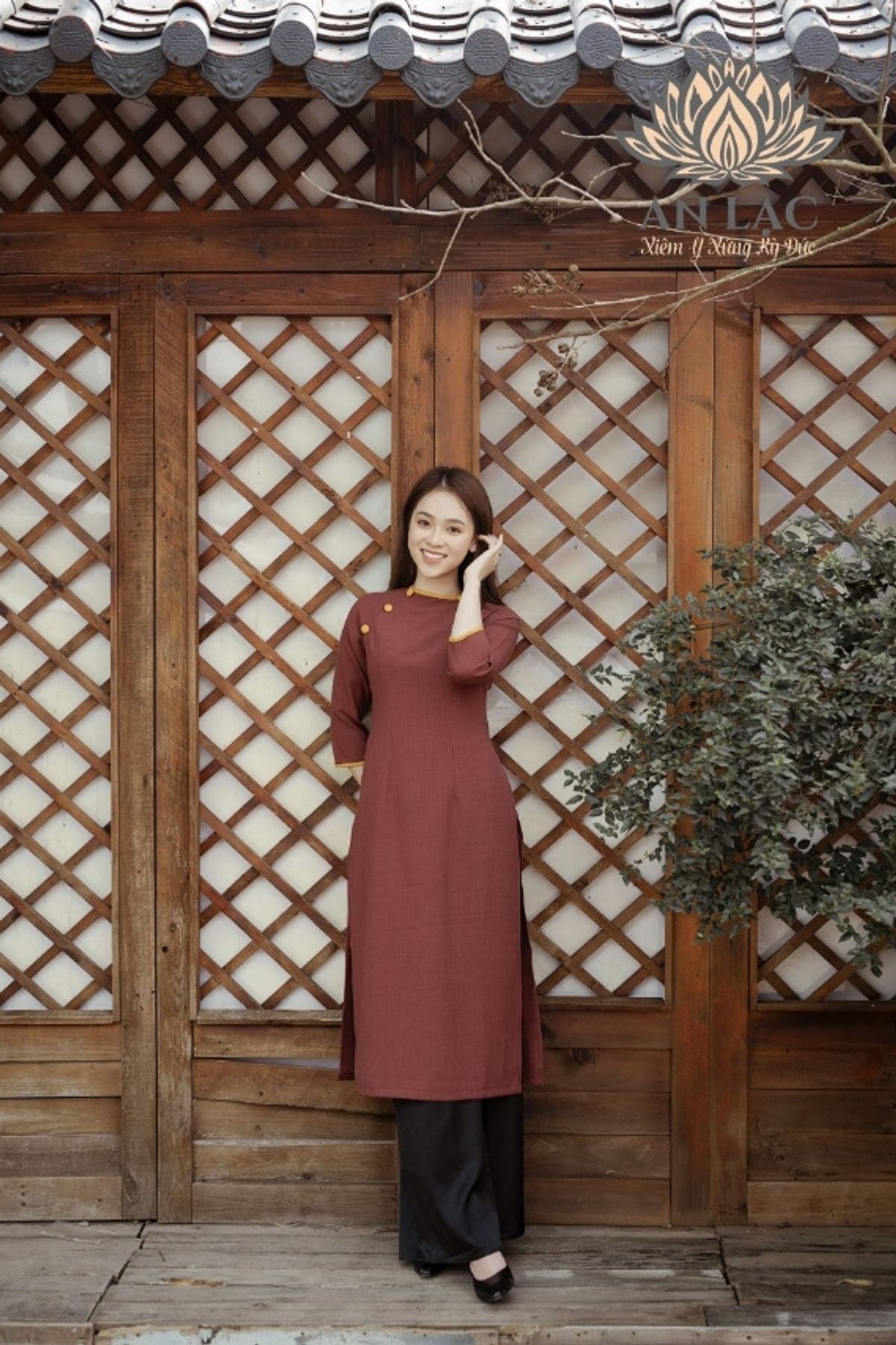 Áo dài Lục Cúc Vàng, với thiết kế tuy đơn giản, nhưng lại thể hiện nét tinh tế qua từng đường viền tay, cổ áo và sáu cúc vàng nhấn thanh vai. Thể hiện được sự giản đơn nhưng nhiệt thành trong tâm tình của những người tu hành.