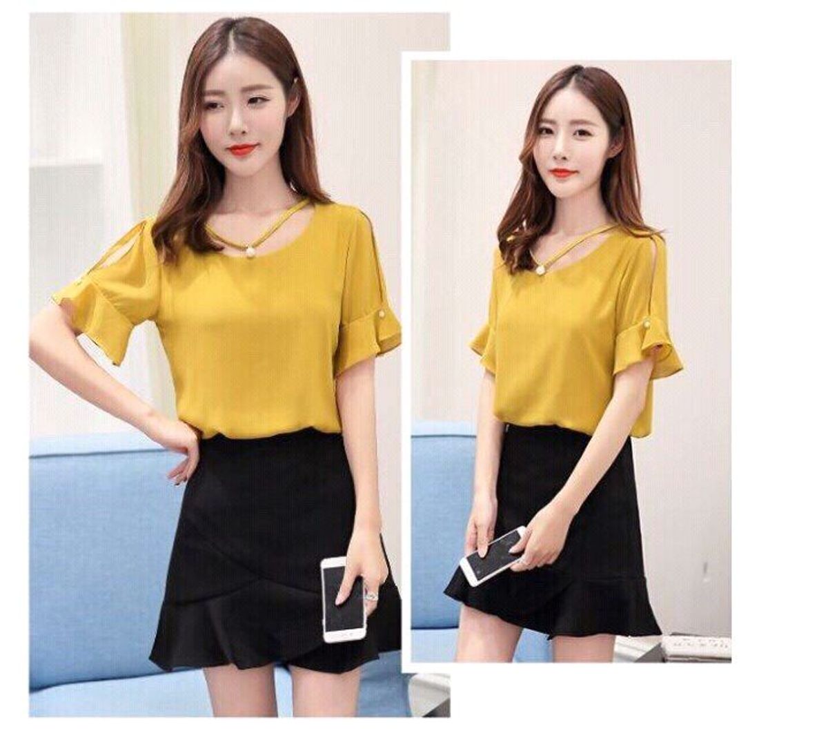 Kiểu dáng: Áo kiểu cổ cách điệu, tay ngắn