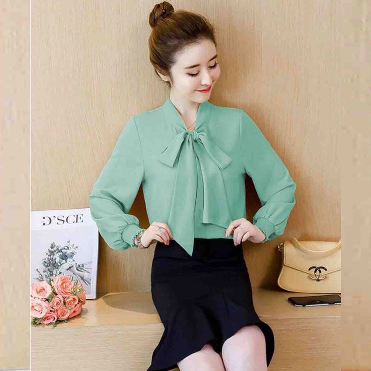 Kiểu dáng: áo suông cổ nơ tay bo phồng thanh lịch mặc thoải mái phù hợp nơi văn phòng,đi làm,đi học..
