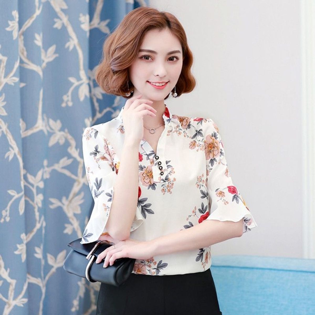 Kiểu dáng: Áo sơ mi Cổ Trụ V, kiểu tay loe thời trang hè 2017