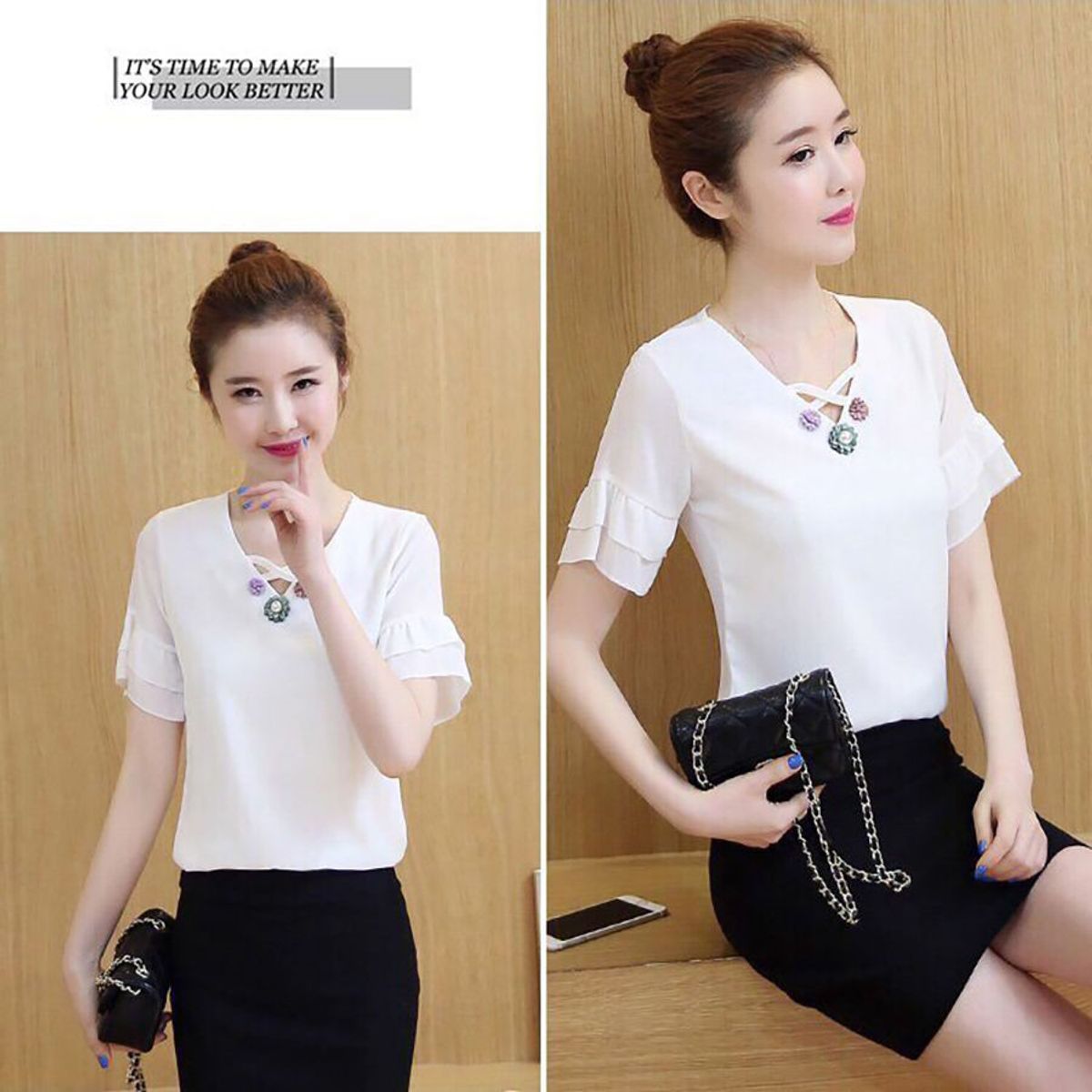 Kiểu dáng: áo suông rộng, cổ v phối dây chéo, đính hoa, tay ngắn phối bèo 2 tầng, vạt ngang Màu sắc: xanh, hồng Chất liệu: tơ gân, co giãn nhẹ