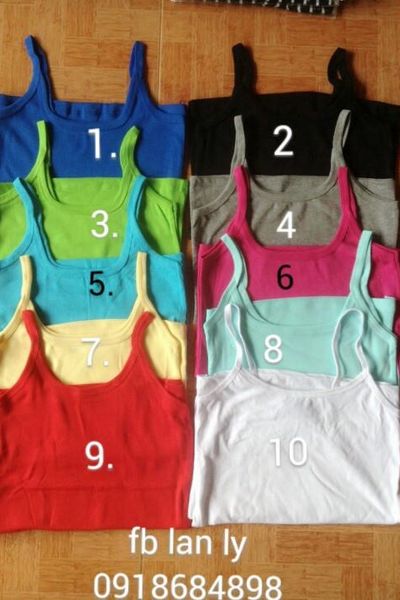 Áo thun 2 dây chất liệu : thun dày đẹp 10 cái 15k 1 cái 25 cái 14.5k 1 cái 50 cái 14k 1 cái 75 cái 13.5k 1 cái 100 cái 13k 1 cái 500 cái giá 12k 1000 cái giá 11k liện hệ : Lan