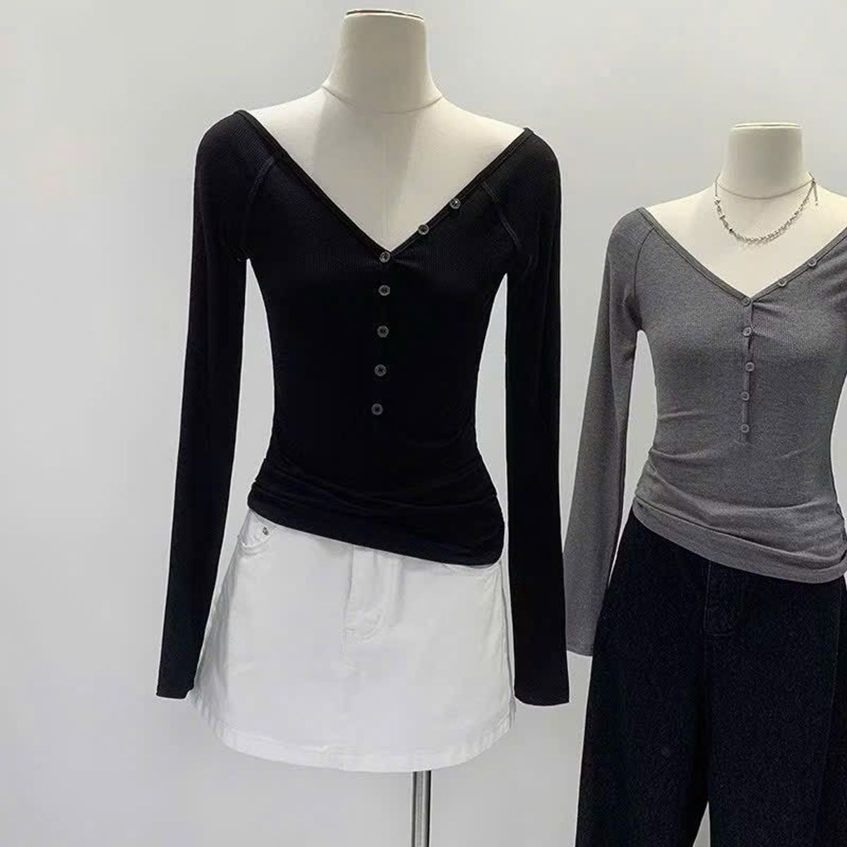 Áo thun cổ V tay dài phối nút giá sỉ/bán buôn