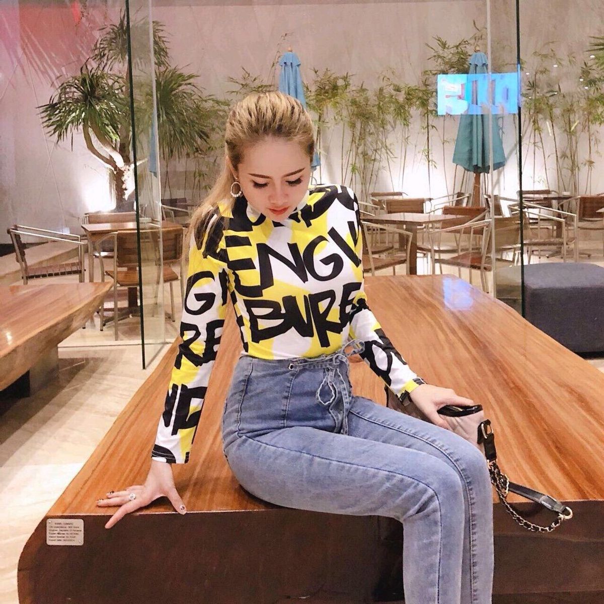 Áo thun ôm dài tay in chữ kết hợp với quần jean mặc lên người rất là tôn dáng các nàng nhé