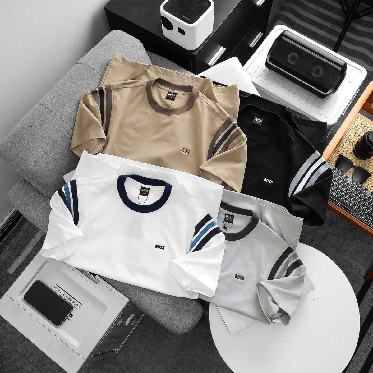 Chất Cotton 100% 4c. Dày Mịn mát. Thấm hút mồ hôi. Chất đẹp. Kiểu dáng phôi tay độc lạ May nét từng đường kim mũi chỉ. . Nét như hàng xịn. In lụa bóng cao cấp kết hợp thêu logo BOSS
