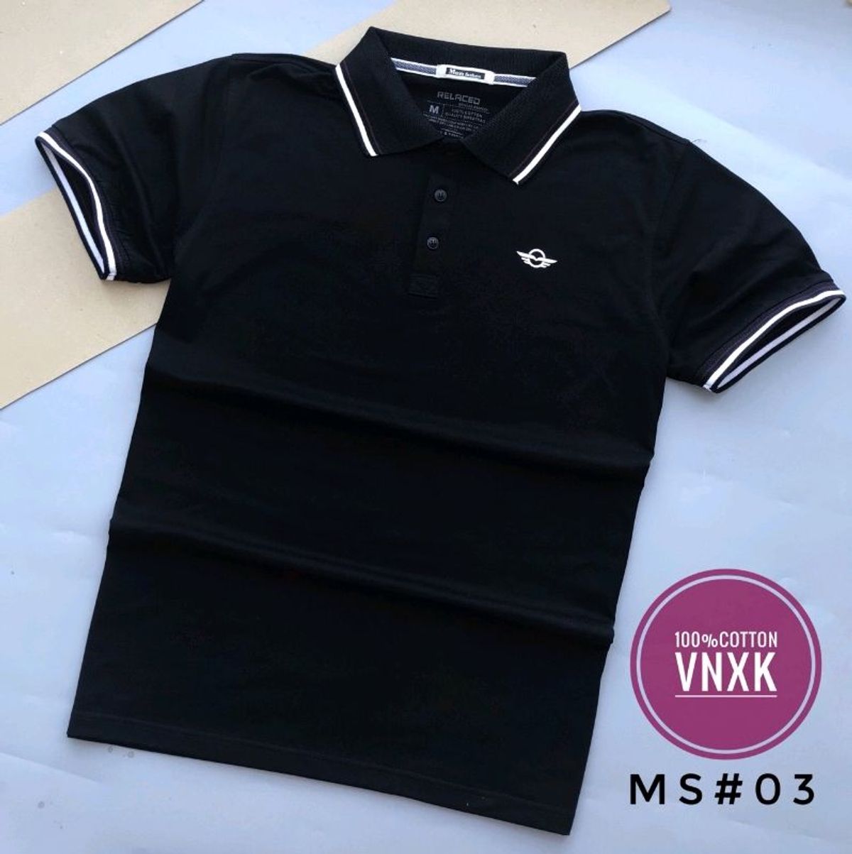 Kiểu: áo thun không túi, in logo, tay ngắn, cổ bẻ.