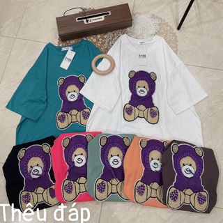 Áo thun nữ 3158 đáp thêu hình gấu nón tím thời trang form rộng tay lỡ vải cotton khô loại 1 xịn sò xinh xắn giá gốc tận xưởng hàng sẵn số lượng lớn giá sỉ/bán buôn