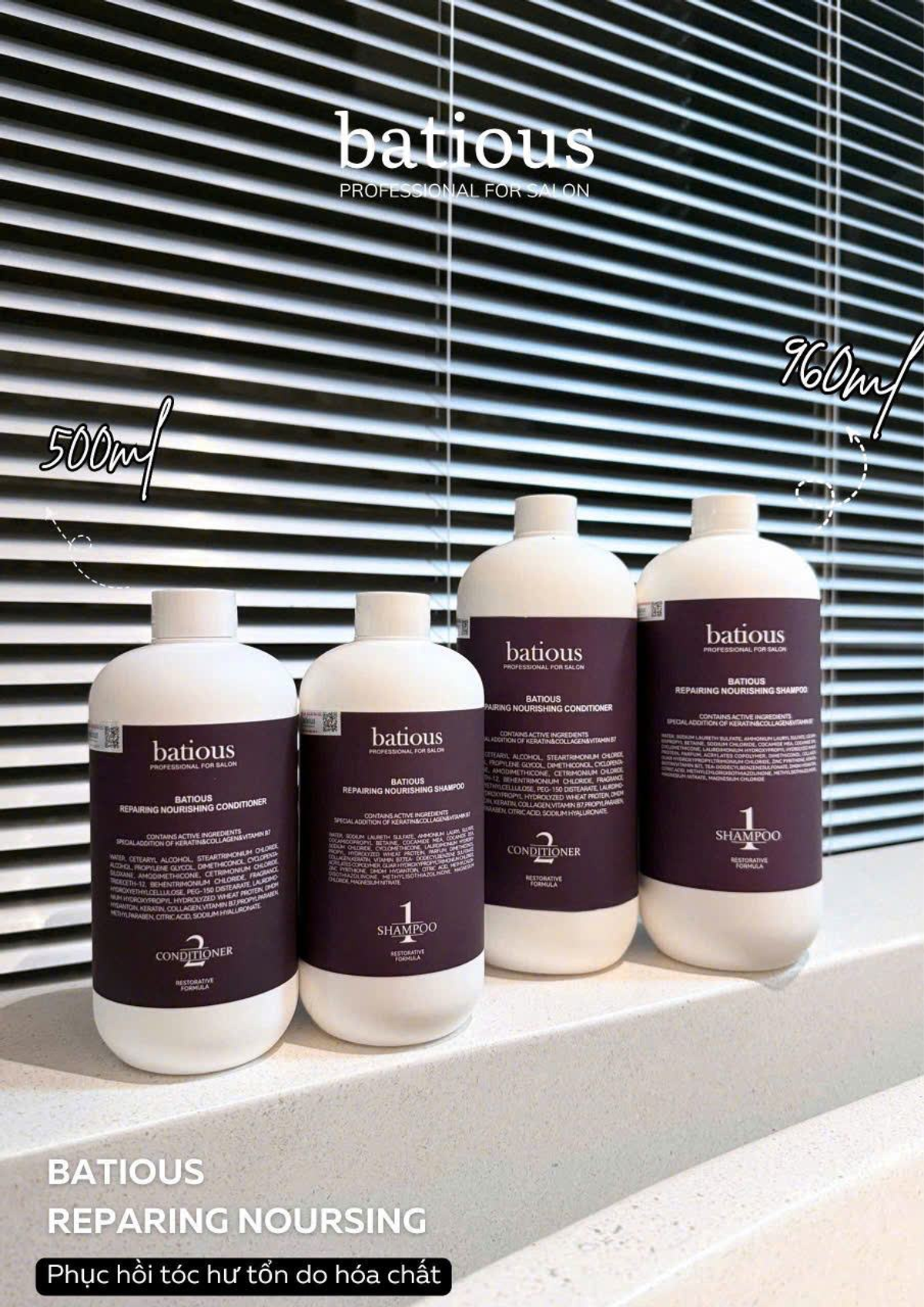 Bộ gội xả Batious Tím 960ml x2 giúp nuôi dưỡng tóc hư tổn, phục hồi và làm mềm mượt tóc, mang lại mái tóc óng ả, chắc khỏe 🌿💧. Phù hợp mọi loại tóc ✨.