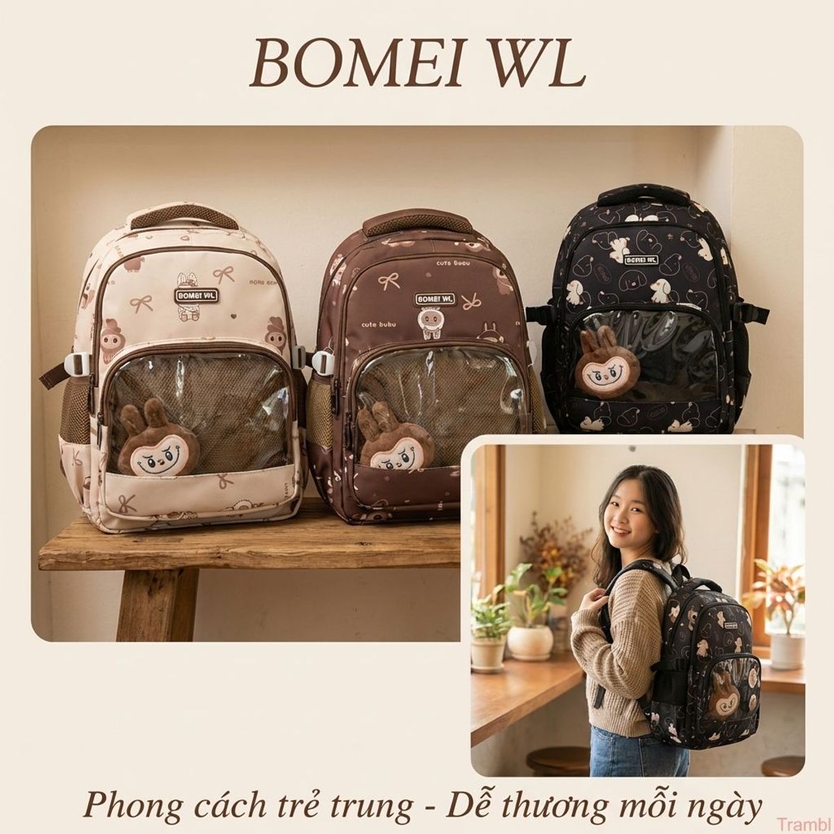 🎒 Balo A3002 họa tiết Labubu nổi bật, thiết kế trẻ trung kèm ghim cài trang trí độc đáo tạo điểm nhấn cá tính.