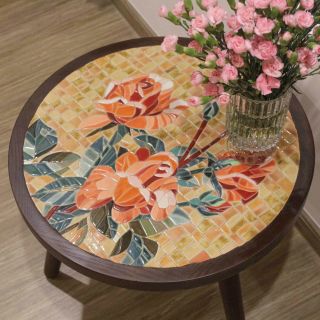 Bàn có viền và chân là gỗ sồi.Mặt bàn là gốm mosaic, bao gồm nhiều mành gốm sứ ghép lại tỉ mỉ với nhau tạo nên một tác phẩm vô cùng độc đáo.Kích thước: đường kính 55cm, cao 45 cm.