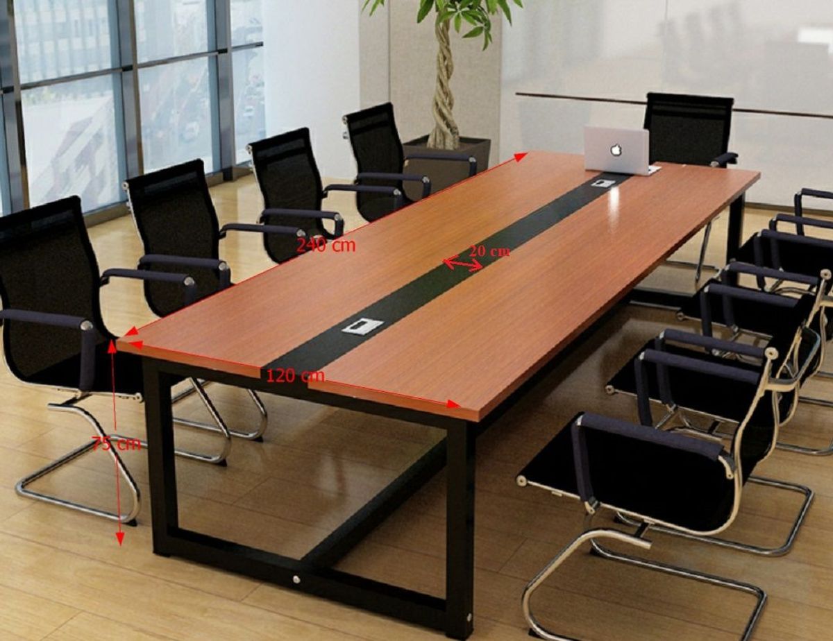 Bàn họp 120cm x 240cm x 75cm (dài x rộng x cao), dày 2.5cm được kết hợp tinh tế từ ván MDF phủ melamine cao cấp và chân sắt hộp 50mm sơn tĩnh điện chống gỉ mang lại độ bền cao theo thời gian.