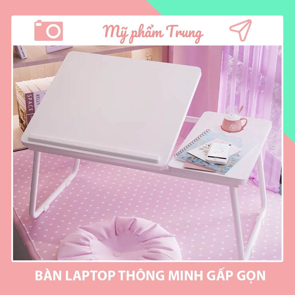 Công dụng - Bàn được làm từ gỗ ép sơn màu hiện đại trẻ trung phù hợp với mọi gia đình - Bàn có chân làm bằng hợp kim chắc chắn, có thể gấp vào, mở ra dễ dàng - Bàn có thể mở ra để sử dụng trên giường tiện lợi, phù hợp với mọi người - Bàn có chân để Ipad + laptop giúp bạn làm việc dễ dàng hơn mà không bị hạn chế không gian - Thuận tiện cho việc đọc sách