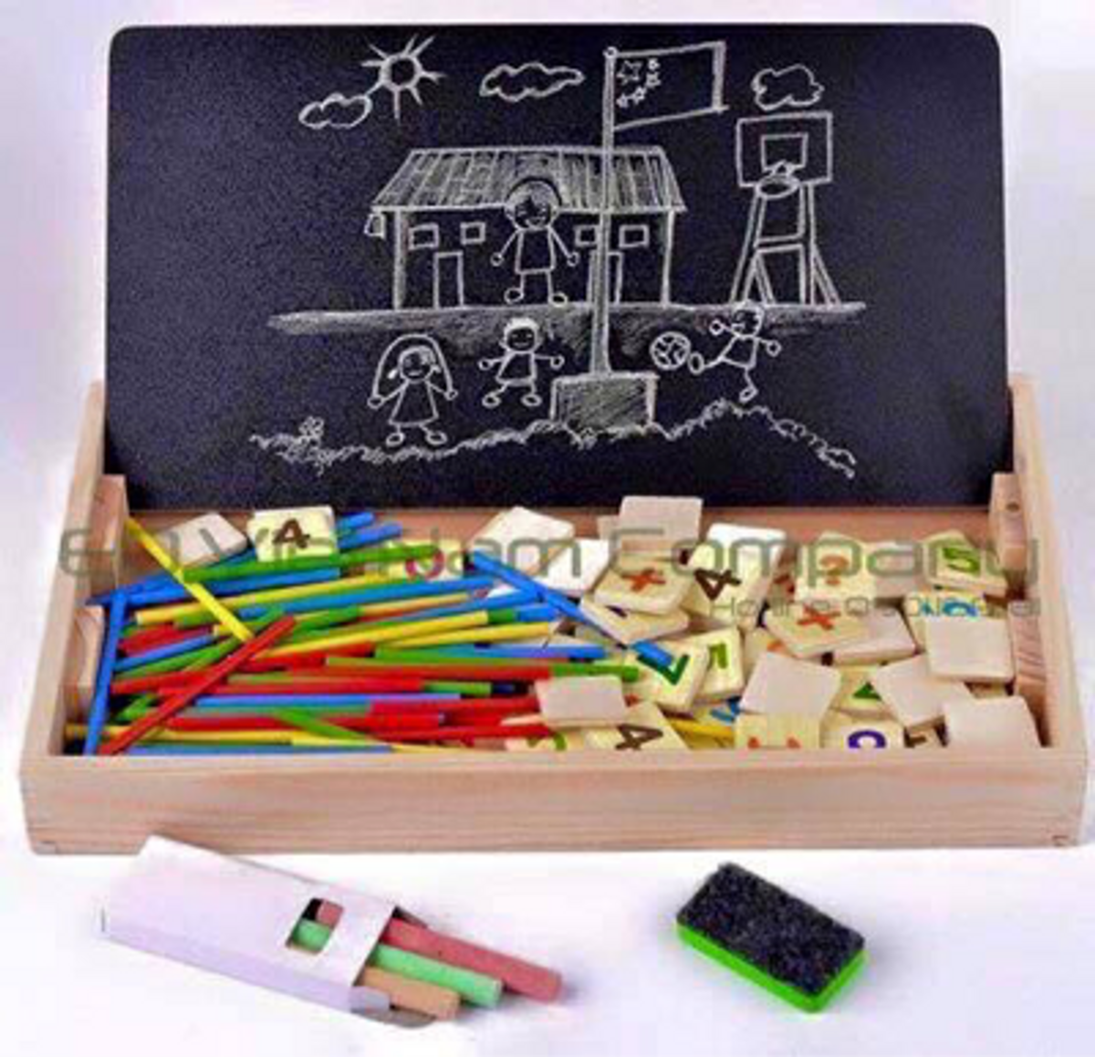 – Bao gồm: 1 bảng 2 mặt – 1 mặt ghép , xem giờ và 1 mặt viết phấn, que tính, và phấn màu.