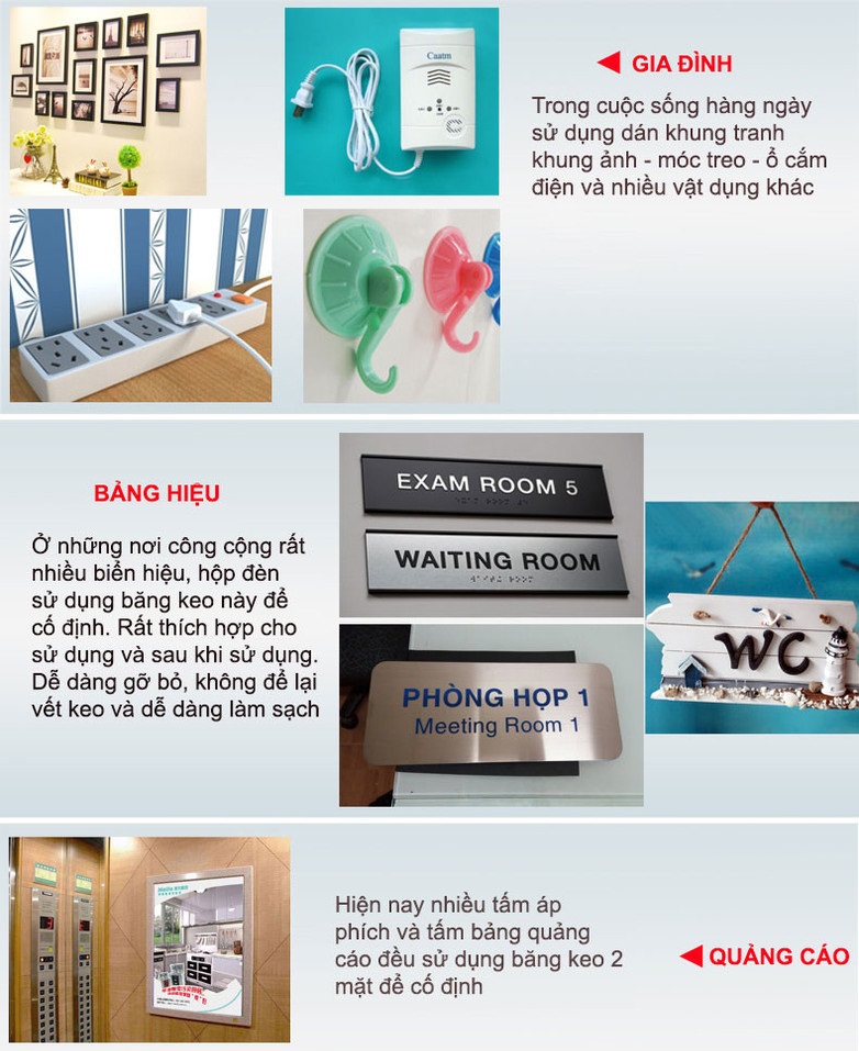 • Sử dụng keo dán acrylic cải tiến ở cả hai mặt, tạo độ bám dính tốt trên nhiều loại chất liệu bề mặt.