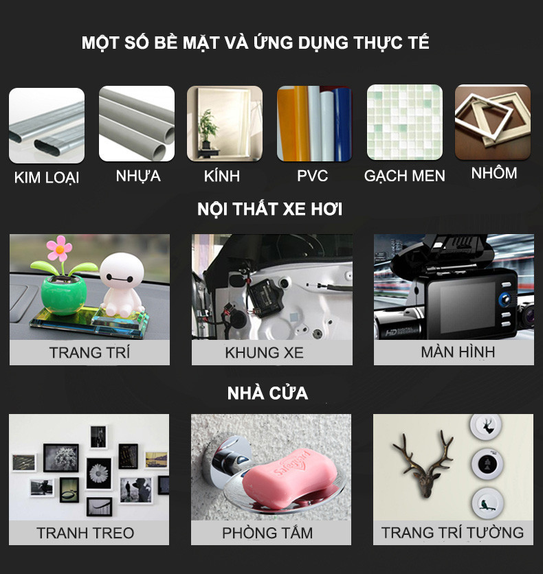 • Liên kết với nhiều loại vật liệu bao gồm cả kim loại,thủy tinh, bề mặt được sơn.
