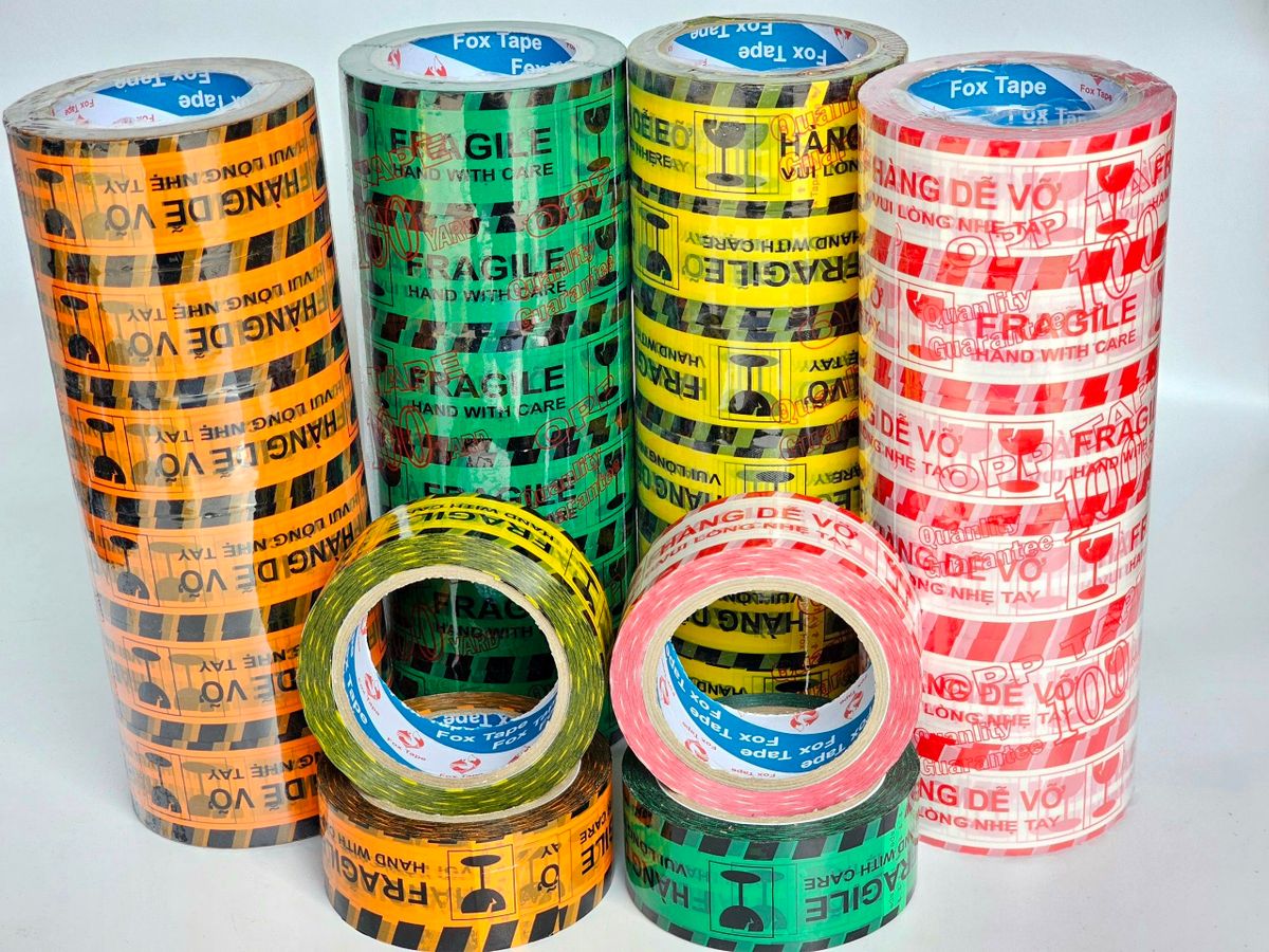 Băng keo in chữ hàng dễ vỡ với 5 màu : trắng đỏ, vàng đen, cam đen, lá đen, vàng đỏ,.. giúp niêm phong hàng hoá và tăng tính chuyên nghiệp cho kiện hàng.