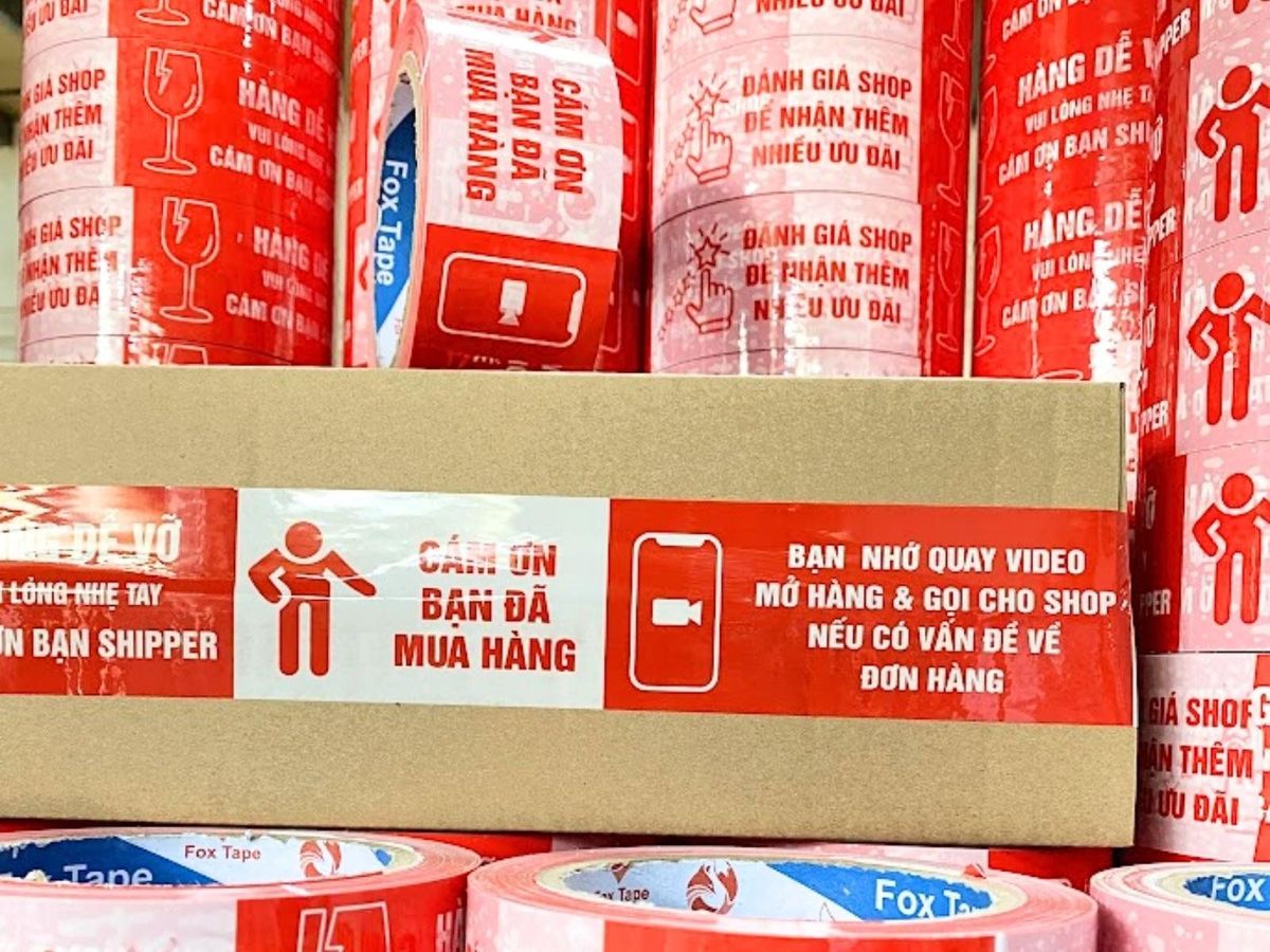 Giờ đây quý khách có thể tiết kiệm tối đa chi phí đóng gói khi 4 nội dung quan trọng cần dán trên các kiện hàng dễ vỡ đã được tích hợp trong 1 cuộn băng keo.