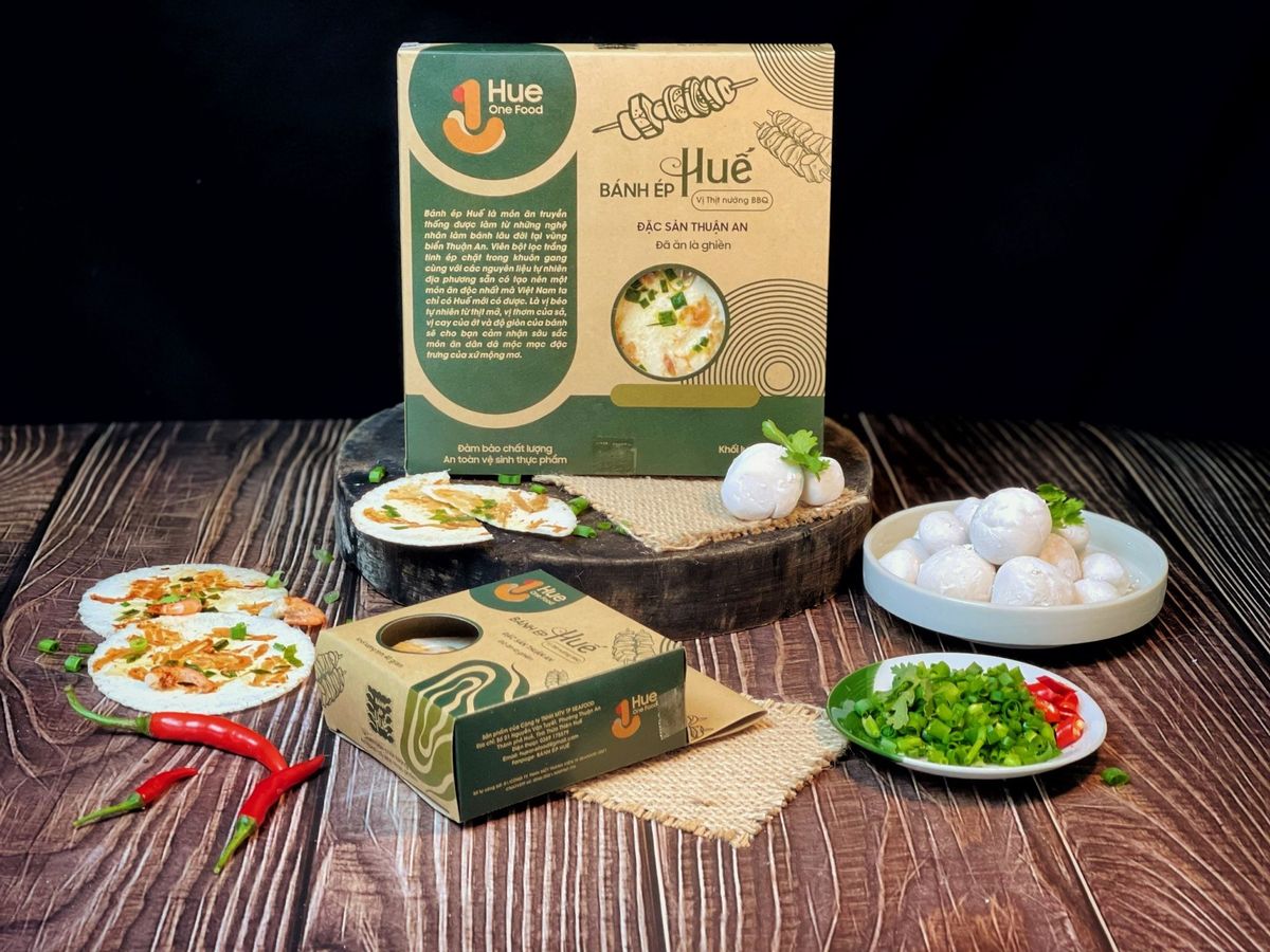 - Bánh ép Huế vị thịt nướng BBQ size lớn hộp 85gram hiện đang được sản xuất và phân phối bởi Hue One Food.