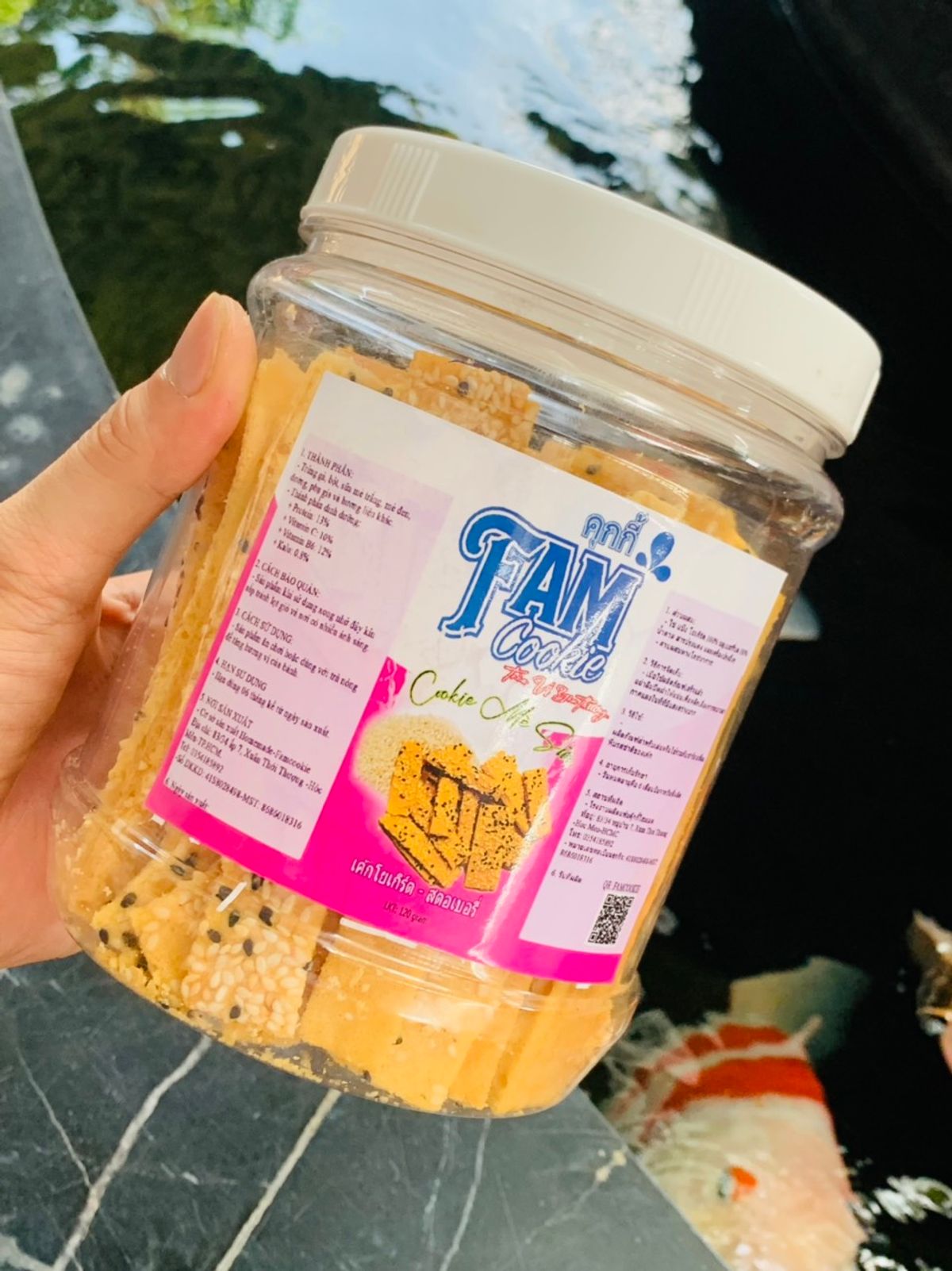 Bánh ngói mè vừng FAMCOOKIE nhân mỏng mỏng, ăn giòn rụm, bùi bùi, beo béo của hạnh nhân, thơm phúc mùi bơ, cực kỳ ngon, ai ăn cũng thích.