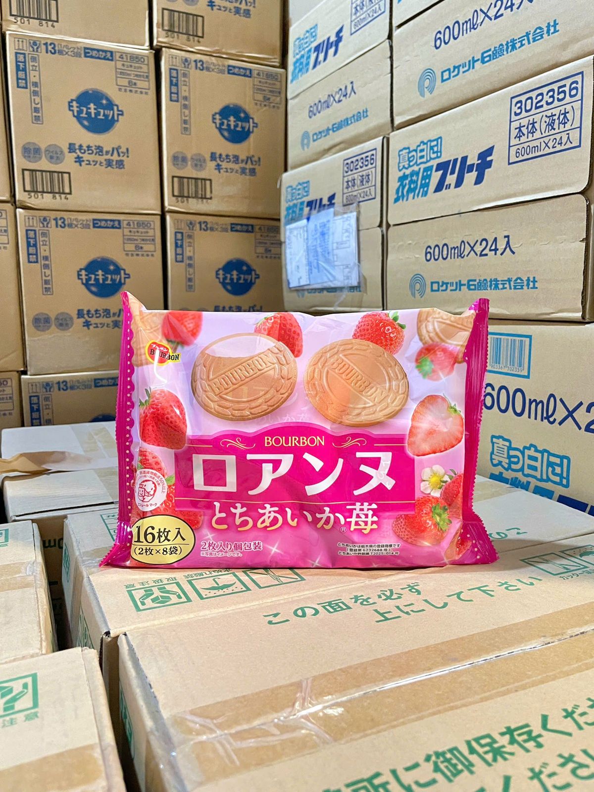 Bánh Quy Roanne Vị Dâu Bourbon là dòng bánh quy kẹp kem (sandwich cookie) cao cấp từ Nhật Bản của thương hiệu Bourbon, nổi bật với lớp vỏ bánh giòn tan, vị ngọt thanh của nhân kem dâu tây dịu nhẹ, kết hợp hương vị bơ sữa thơm lừng, tạo nên trải nghiệm ăn vặt tinh tế, không quá ngọt, giàu năng lượng, lý tưởng để dùng kèm trà/cà phê hoặc làm quà biếu tặng sang trọng nhờ thiết kế bao bì tiện lợi, cao cấp.