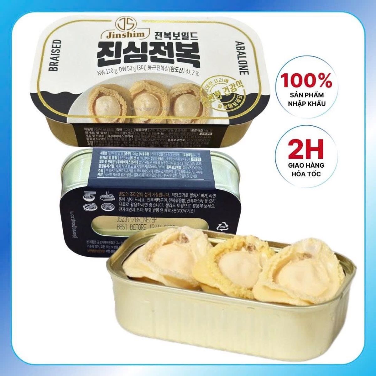 Bào Ngư Ngâm Muối Đóng Hộp là sản phẩm cao cấp nhập khẩu từ Hàn Quốc, gồm 3 con bào ngư nguyên vẹn, được hấp chín và ngâm muối nhẹ trong nước kho tự nhiên – giữ nguyên độ tươi ngọt và hương vị đặc trưng của bào ngư.