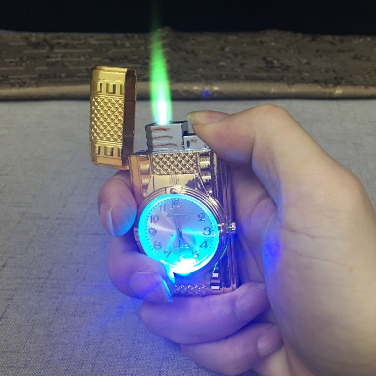 Đánh lửa Kiêm Đồng Hồ sử dụng gas dạng lửa khò Sự kết hợp độc đáo của đánh lửa cùng với đồng hồ đeo tay sẽ mang đến cho bạn một sản phẩm độc đáo có 1 không 2 cực kỳ tiện dụng. Với chất liệu kim loại chiếc đánh lửa trông cứng cáp và tạo cảm giác thoải mái khi cầm trên tay. Ngoài ra chiếc đồng hồ còn được trang bị thêm đèn Led tự sáng khi đánh lửa giúp bạn có thể theo dõi thời gian trong buổi tối.