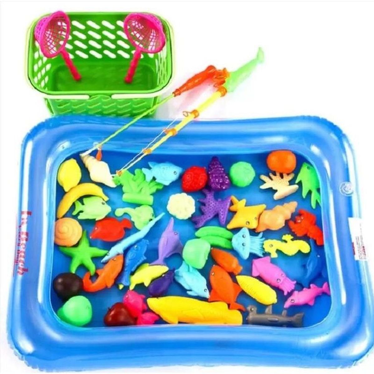 3 cần , 3 vợt , 1 rổ đựng cá , 1 bể phao và.nhiều con cá với màu sắc khác nhau...