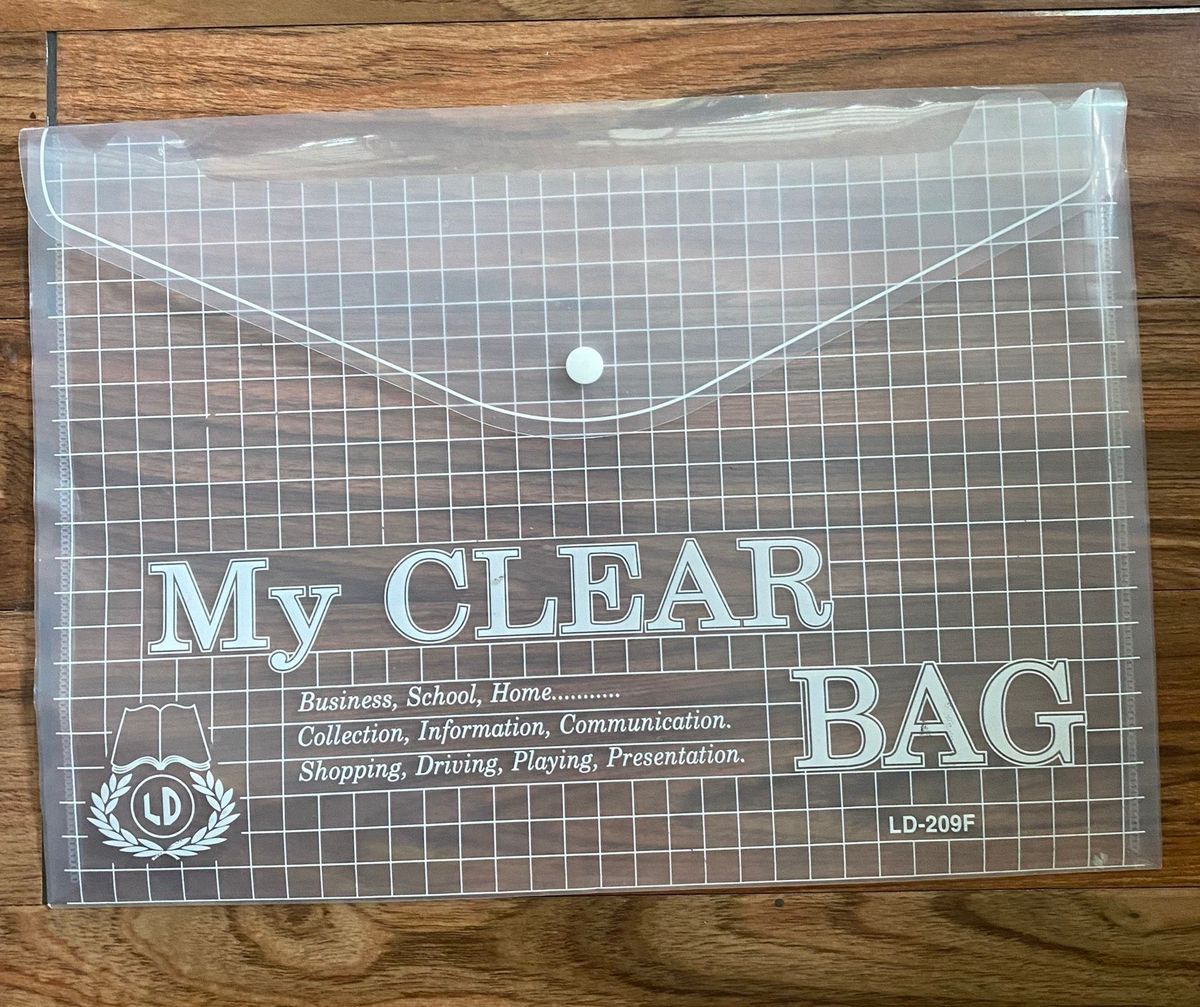 Bìa nhựa PP trắng trong, có nắp, gài nút bằng nhựa, kích thước: (23,5 x 33)cm