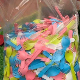 - Dĩa nhựa mix nhiều màu, muỗng dĩa nhựa kết hợp thật tiện lợi, chuyên dụng để dùng các loại bánh mềm như Bánh Kem, Tiramisu, Mousse hoặc Râu Câu