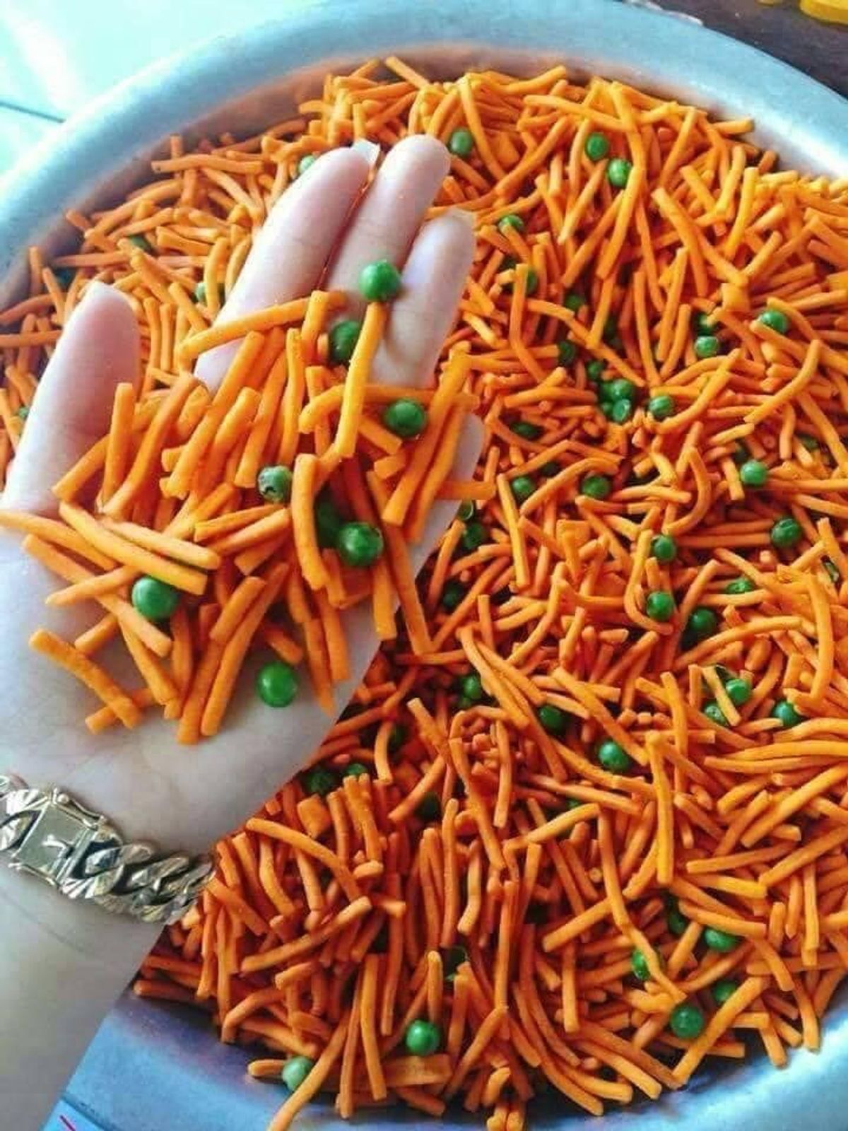 Bim tăm que giòn giòn, cay cay, ngọt ngọt, xen lẫn các hạt đậu hà lan sấy giòn bùi bùi, thêm chút tai heo, đuông dừa giòn thơm,...