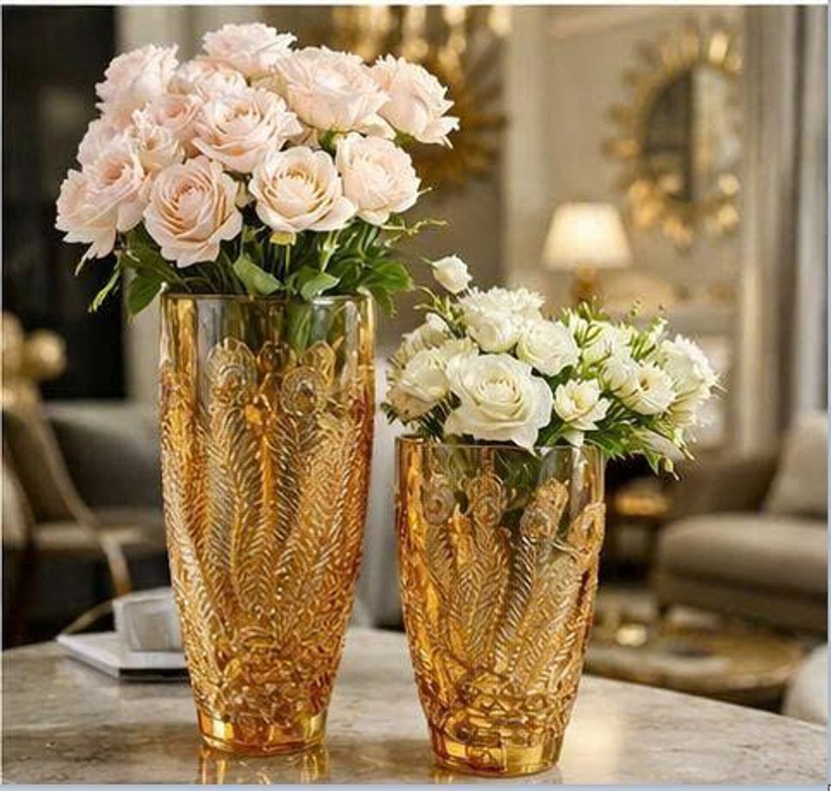 BÌNH CẮM HOA THUỶ TINH VÀNG 30cm HOẠ TIẾT CÔNG (T15)