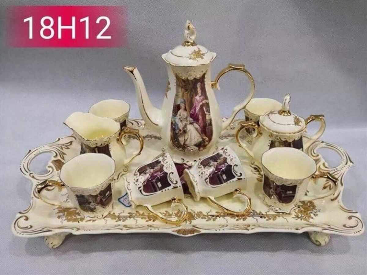 Bộ ấm chén bao gồm: 6 cốc sứ, 1 ấm sứ, 6 đĩa kê.