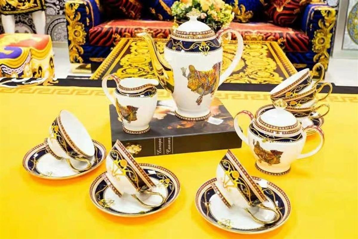 Bộ ấm chén bao gồm: 6 cốc sứ, 1 ấm sứ, 6 đĩa kê.