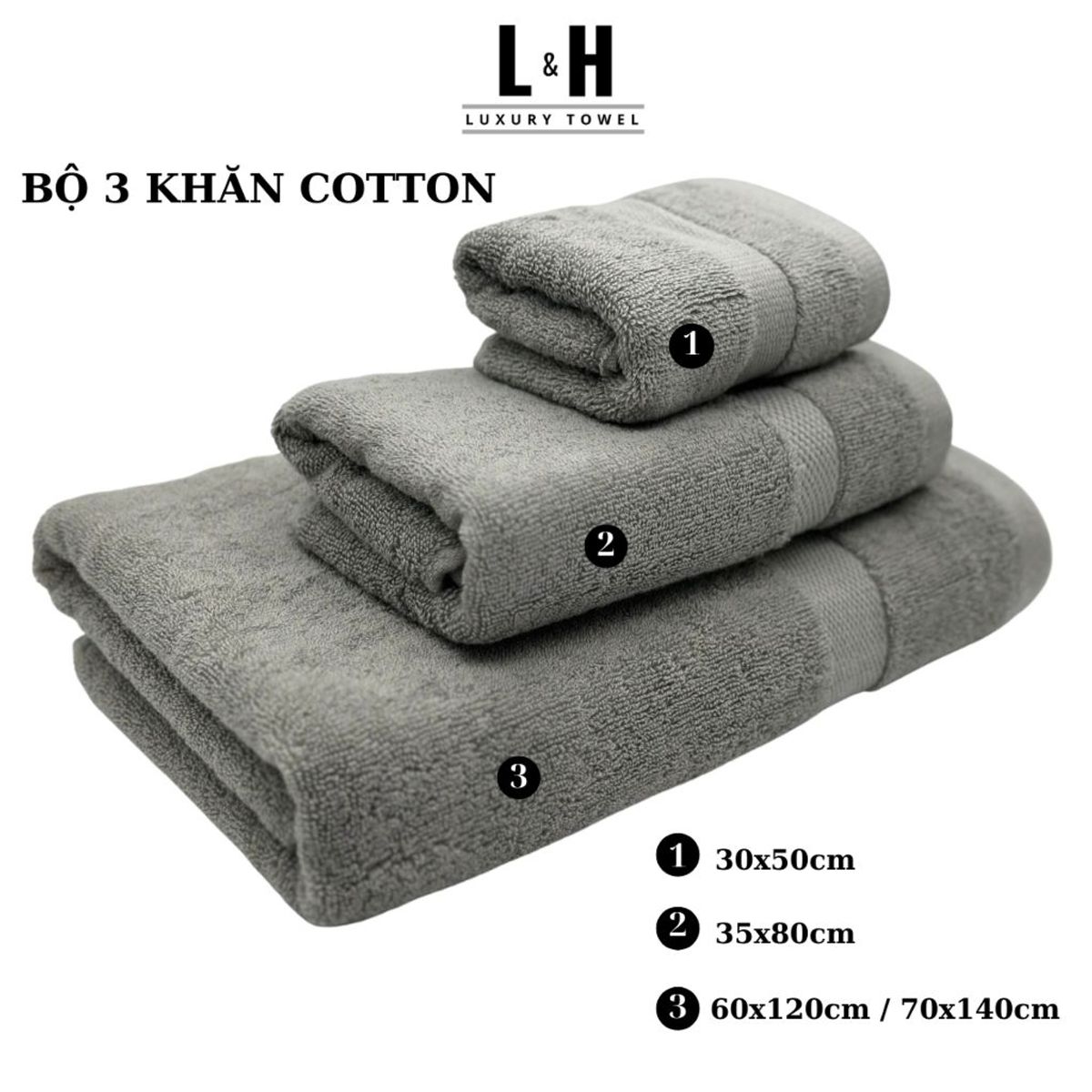 + Bộ 70x140: Gồm 1 khăn tắm 70x140; 1 khăn gội 34x80cm; 1 khăn mặt 30x50cm