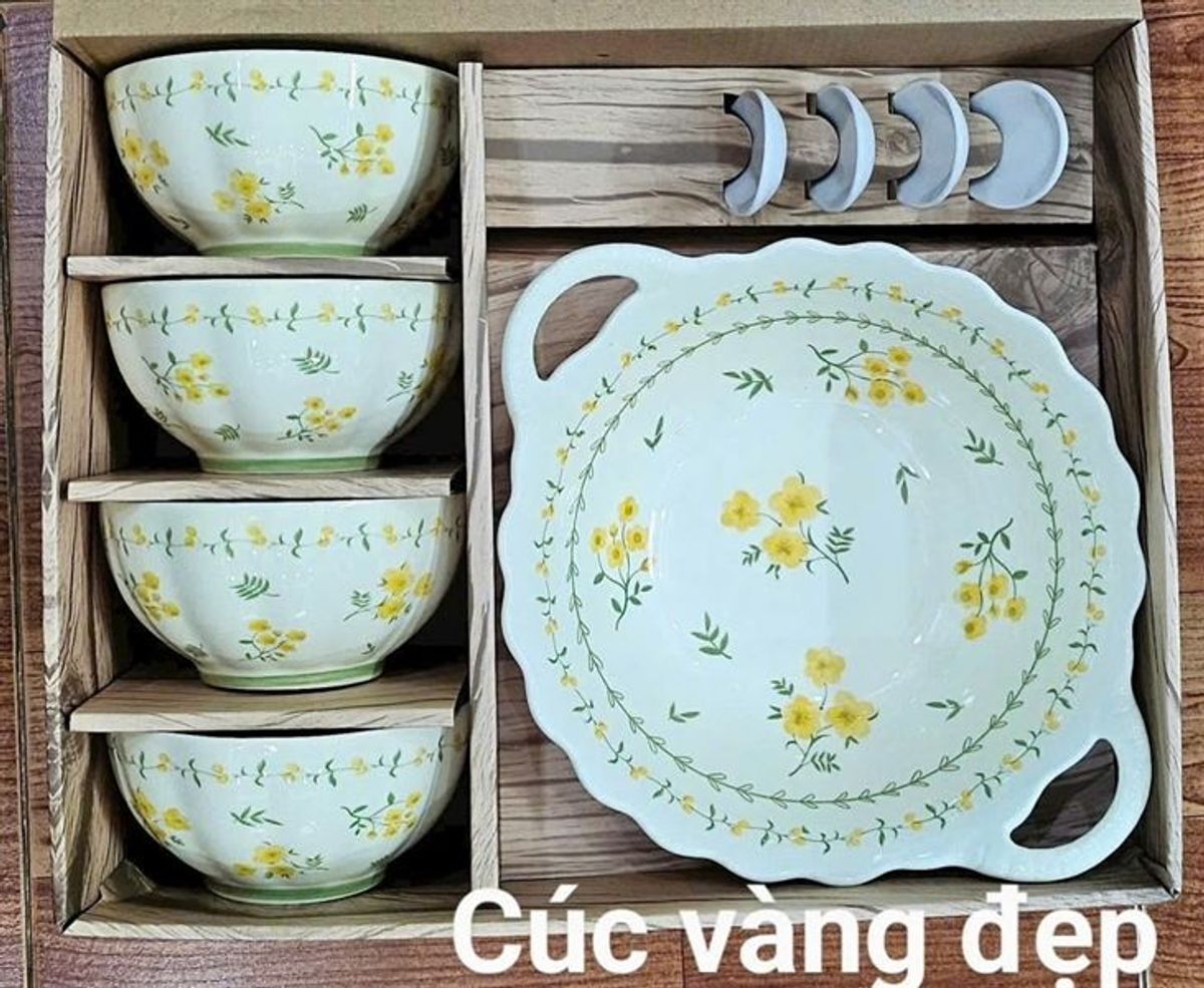 Bộ sản phầm gồm 9 chi tiết: 4 bát con, 1 tô hai tai, 4 thìa sứ.