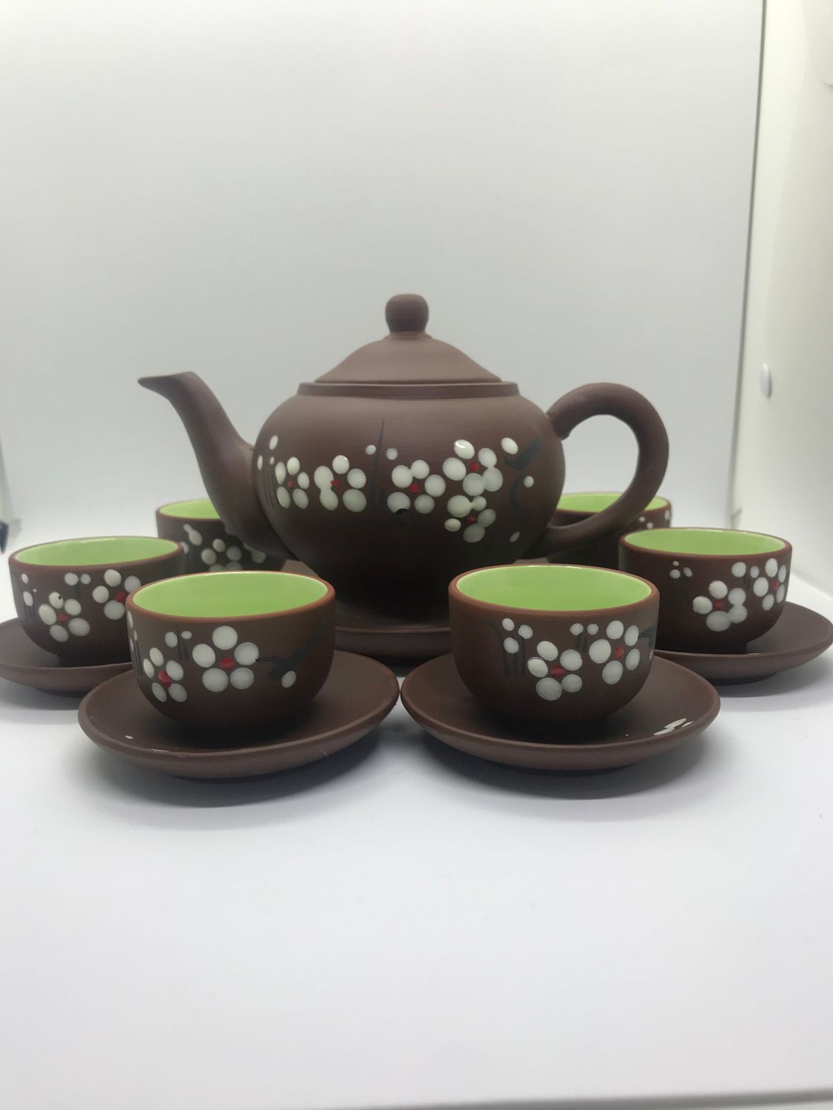 + Bộ ấm chén Bát Tràng vẽ mai trắng phù hợp với rất nhiều không gian trong gia đình bạn từ ngoại thất, nội thất tô điểm thêm cho không gian sang trọng của gia chủ. Sản phẩm được chụp từ điện thoại không chỉnh sửa.