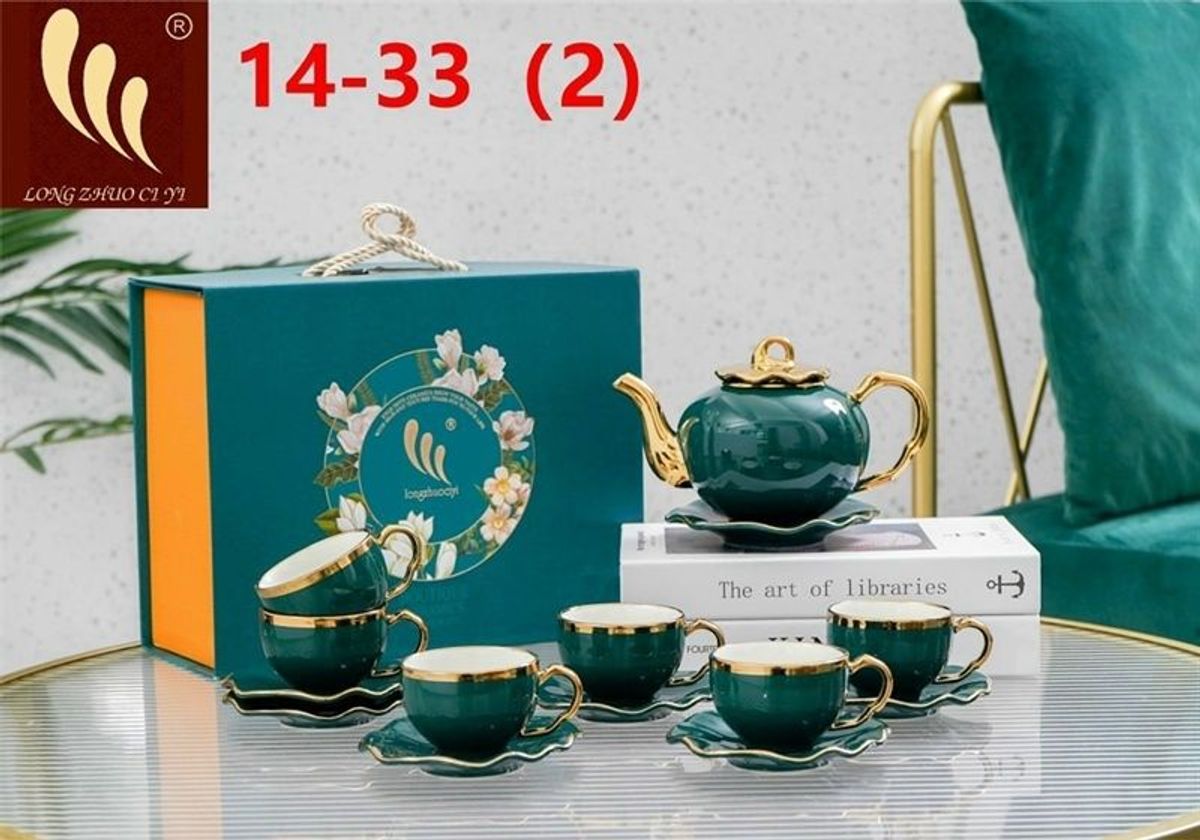Bộ ấm chén bao gồm: 6 cốc sứ, 1 ấm sứ, 6 đĩa kê