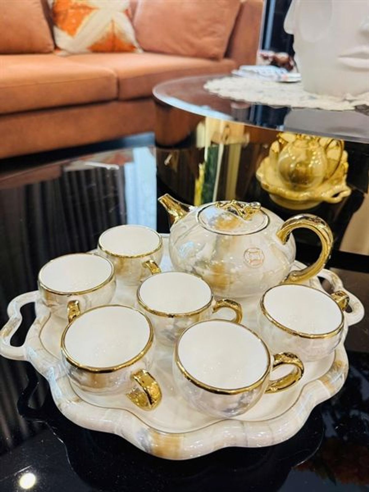 Bộ trà sứ hoa vân đá phong cách Bắc Âu cao cấp kèm khay sứ mạ vàng sang chảnhhh. Trang trí phòng khách, thưởng trà, làm quà tặng...
