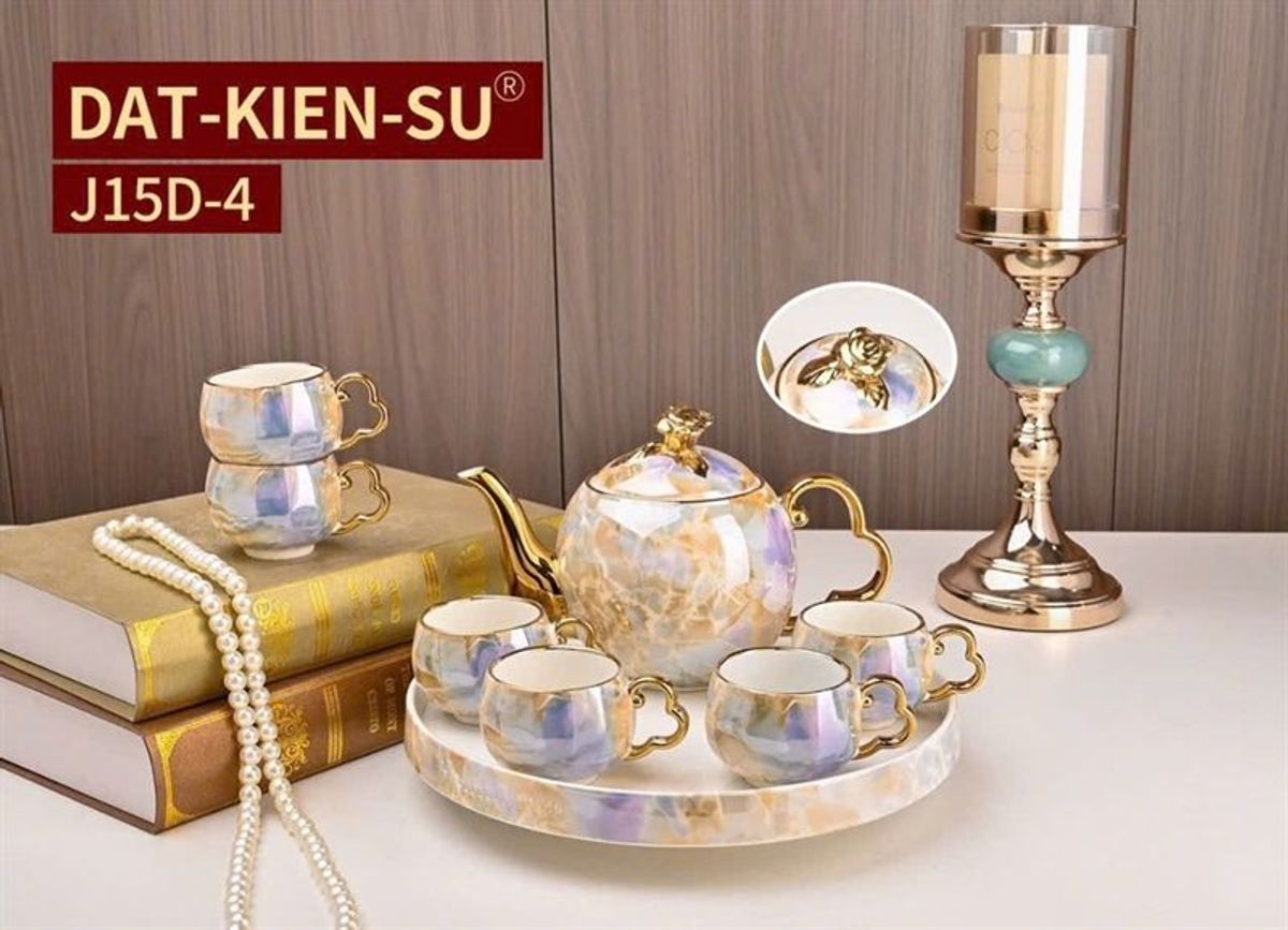 Bộ trà sứ hoa vân đá phong cách Bắc Âu cao cấp kèm khay sứ mạ vàng sang chảnhhh. Trang trí phòng khách, thưởng trà, làm quà tặng...