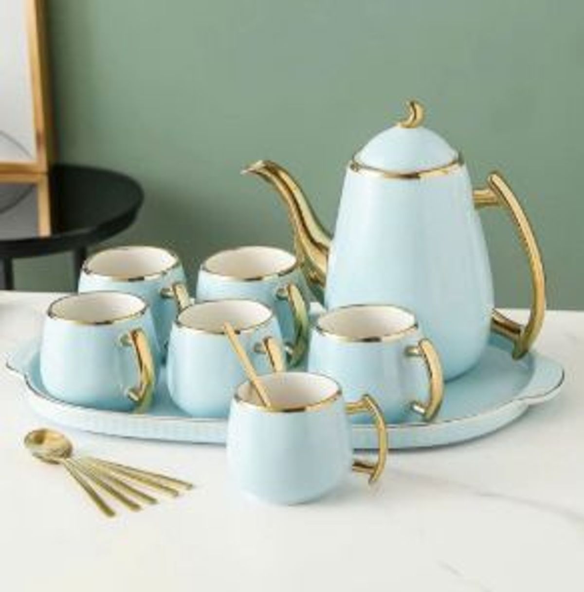 Bộ ấm chén sứ cao cấp màu xanh chỉ vàng cực sang trọng